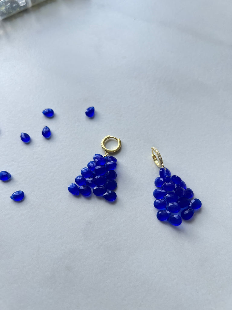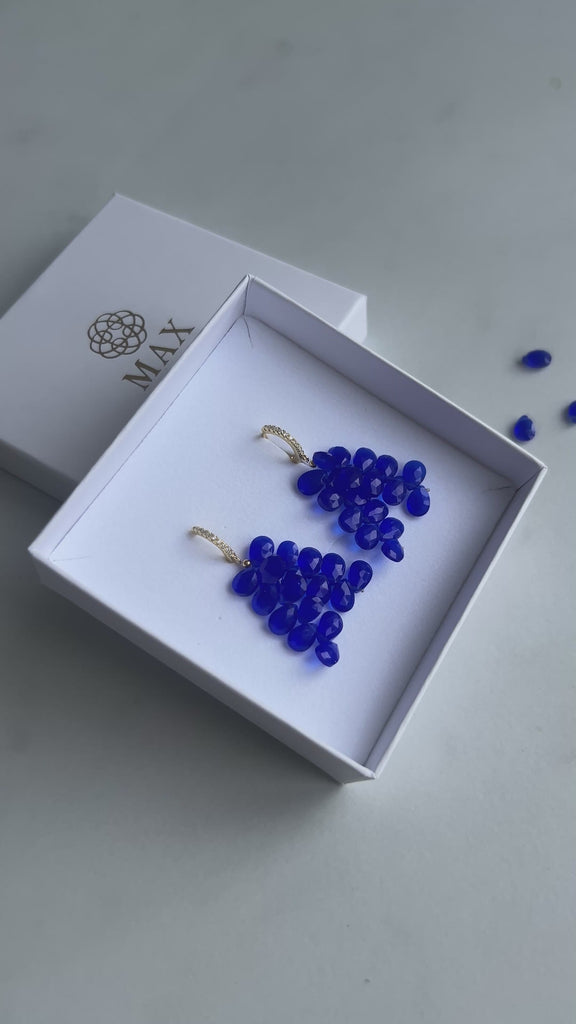 Diese handgefertigten Ohrringe kombinieren leuchtend blauen Chalzedon mit eleganten Kreolen aus 925er Sterling Silber. Die Oberfläche der Kreolen ist vergoldet und mit funkelnden Zirkoniasteinen besetzt.